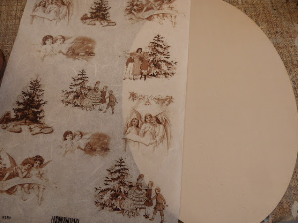 Para el óvalo, pintar del mismo tono lino y luego ponerle uno de los nuevos papeles de arroz, en este caso navideño. Qué bonito es este papel, me parece tan delicado en esos tonos tostados y marrones....