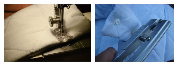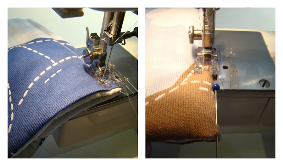 12. Hacemos la pieza interior, primero pasamos el pespunte divisorio y después ponemos los snaps, según indica el patrón: