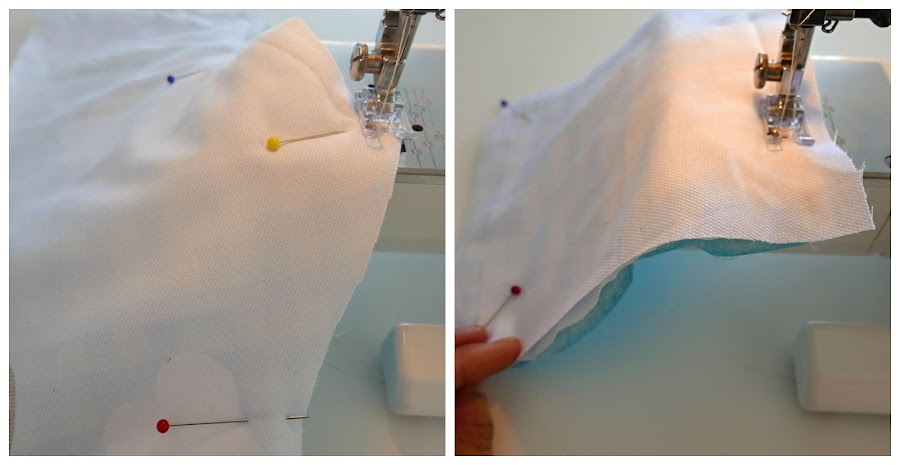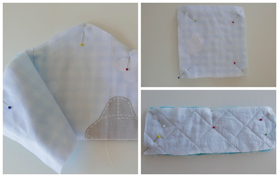 1. Primero comenzaremos cortando las piezas como indica el patrón y las uniremos con alfileres al forro guateado: