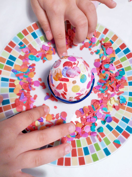 El primero lo decoramos con confettis. Las puedes comprar tal cuál o puedes hacerlas con papel de seda y perforados. De esta forma, puedes elegir los colores que quieras.