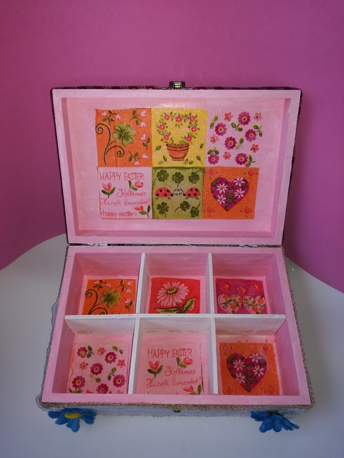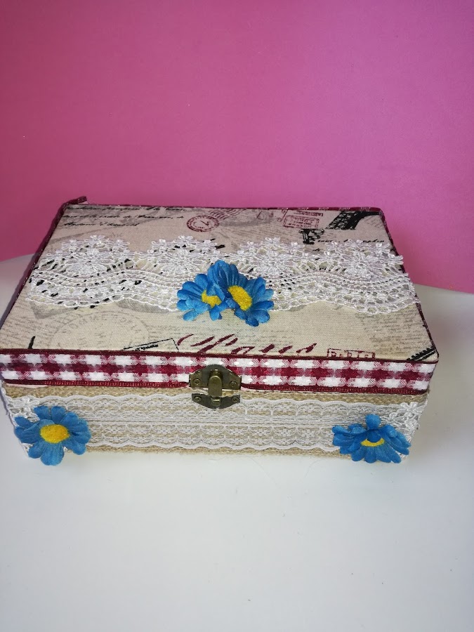 La caja de madera, la tela, y los lazos, los puedes comprar en UN MUNDO PARA TU HOGAR