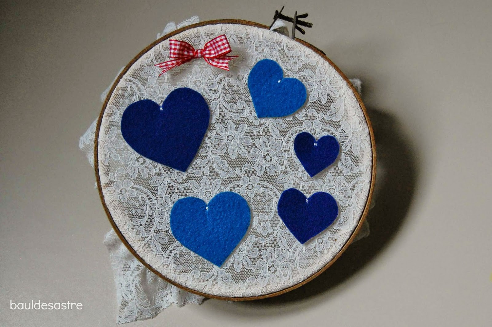 Creo que cinco corazones de fieltro han dado en el clavo, cada uno de un tamaño, distinto tono de azul según el sexo y juntos como una familia.