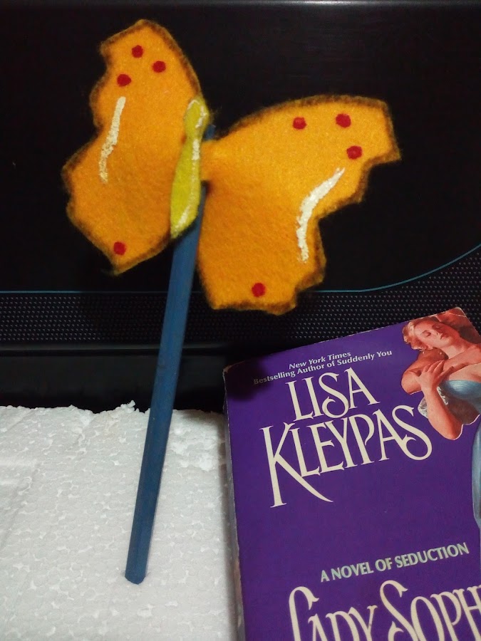 En el medio, con ayuda de un cutter hice dos orificios para introducir el lápiz en la mariposa viceversa :D