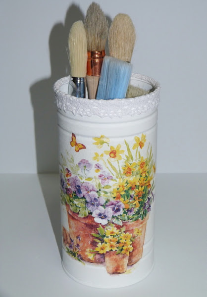 Lata decorada con decoupage con función de almacenaje para brochas y pinceles