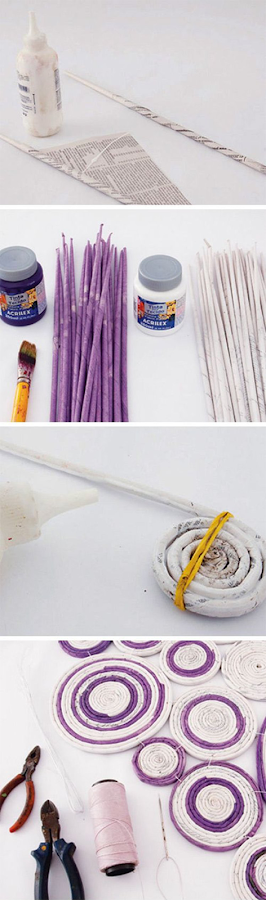 Comenzaremos haciendo varillas de papel, enrollando una hoja sobre si misma, cuando tengamos unas cuantas las pintamos del color que prefiramos. Una vez estén secas las varillas comenzaremos a enrollarlas en espiral hasta conseguir distintos tamaños de círculos, que iremos pegando con cola según avancemos, dejarlos secar sujetándolos con gomas. Luego uniremos estos círculos con hilo ,ayudándonos de una aguja y unos alicates.