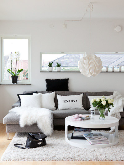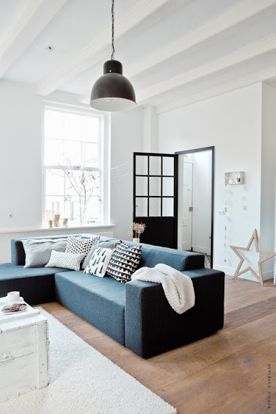 En esta foto veo algo muy recurrente últimamente en ambientes nórdicos y es la combinación de sofá gris con cojines o accesorios en blanco y negro. Antes yo pensaba que el gris, sobre todo oscuro, no iba con el negro pero la verdad es que queda muy bien. Me encantan esos estampados nórdicos en los cojines...¡Tengo que ir a Ikea pronto!