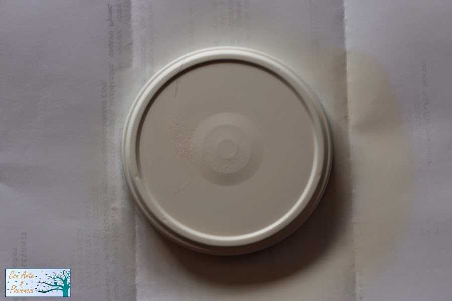 1. Pintar la tapadera con spray blanco si el washitape es un poco transparente como el de arroz. Si vamos a utilizarlo para comida procurar que no caiga pintura dentro de la tapadera. Esto hacedlo solo si el washitape que vais a utilizar transparenta, como es el caso de lso que están hechos de arroz.