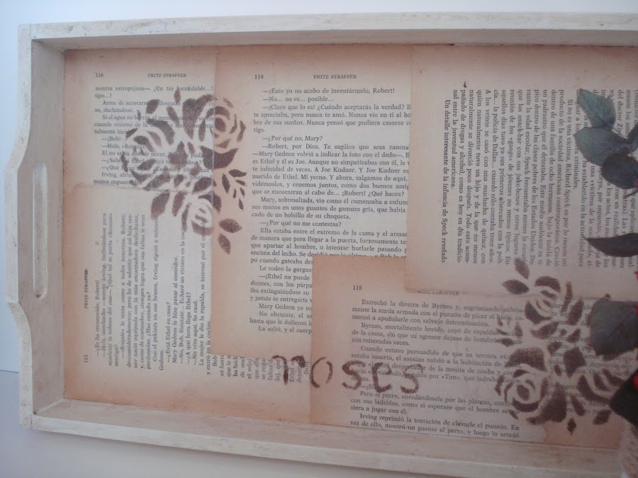 En el fondo decoupage con unas hojas de libro