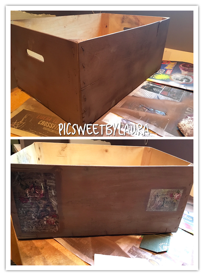 6 Para acabar de rematar, utilicé la técnica del transfer de imágenes/texto sobre la caja, ahí sí que no lo recomiendo mucho porque cuando mojas el papel y empiezas a quitarlo con el dedo, te acabas llevando un poco de pintura y de imagen también. Quizás al tener una textura más líquida es más propensa a este tipo de cosas (o también puede ser que debería haber esperado más días para que la pintura estuviera más seca).