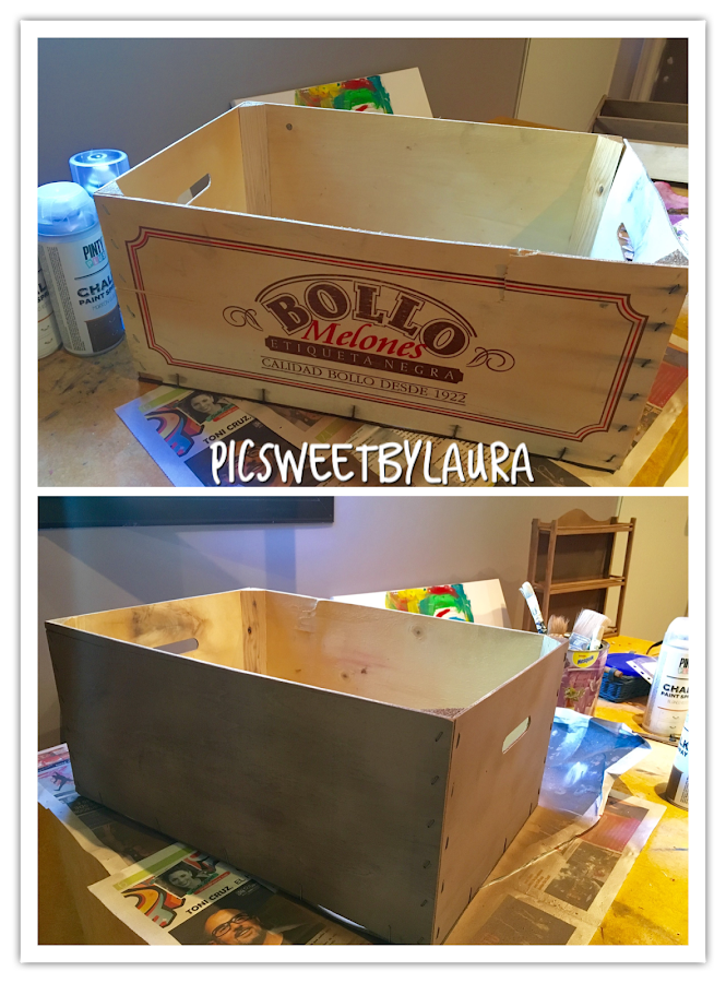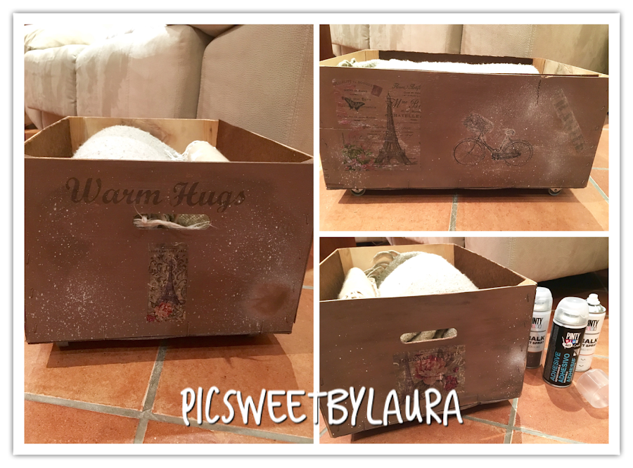 Cuando fui a la feria Creativa el pasado mes de noviembre, me fijé en que en muchos stands vendían chalk paint en spray (esto creo que ya lo había comentado en alguna entrada), y tenía muchas ganas de saber qué tal funcionaban, aunque no sabía bien bien cómo y sobre qué utilizarla. El tema de las cajas de frutas está muy chulo, pero también muy visto, y en la web hay miles de entradas dedicadas a ellas. Seguramente mi caja no es la mejor ni la más bonita, pero tiene un objetivo en la vida. No sé en vuestra casa, pero a mi no me gusta que las mantas corran libres por mis sofás, estoy cansada de colocarlas en los brazos de los mismos, en los reposacabezas, a un ladito, enrolladas, ya no sabía cómo ni dónde ponerlas para que no molestaran, y por esto se me ocurrió decorar una caja y utilizarla como guarda mantas de sofá. ¿Y adivináis con qué la pintaría?