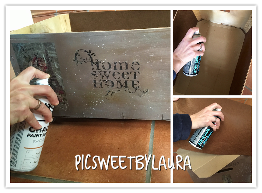 5 Ahora tenemos un lienzo marrón precioso para decorar a nuestro gusto. Aquí me la jugué un poco porque quería experimentar, y se me ocurrió probar a hacer decoupage con el spray adhesivo, a ver qué pasaba. Recorté mis imágenes y puse spray en la parte de la caja donde iría pegado nuestro dibujo, en el papel no puse nada. Pegué y ¡el papel se adaptó perfectamente! ¡Genial! No hace falta usar el barniz cola especial, es bueno saberlo porque una a veces no tiene de todo en casa.