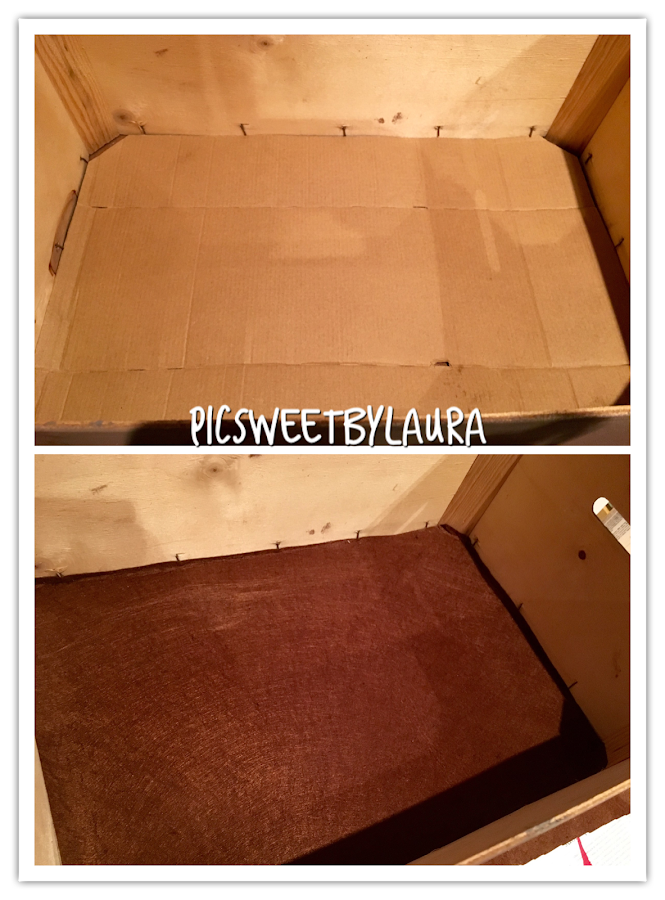 Ya tenemos pegado el fondo (cartón y fieltro), si queréis podéis hacer lo mismo con los laterales; yo lo hice para que quedara bien forradito, pero eso va a gustos.
