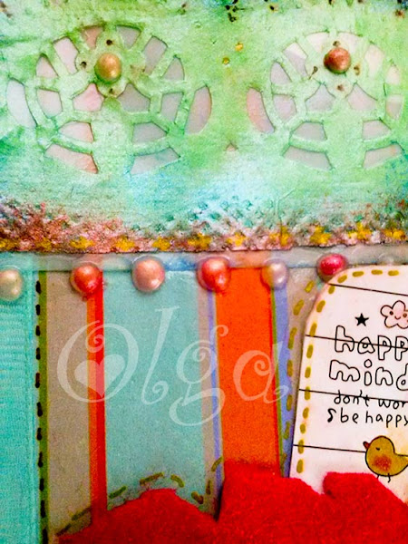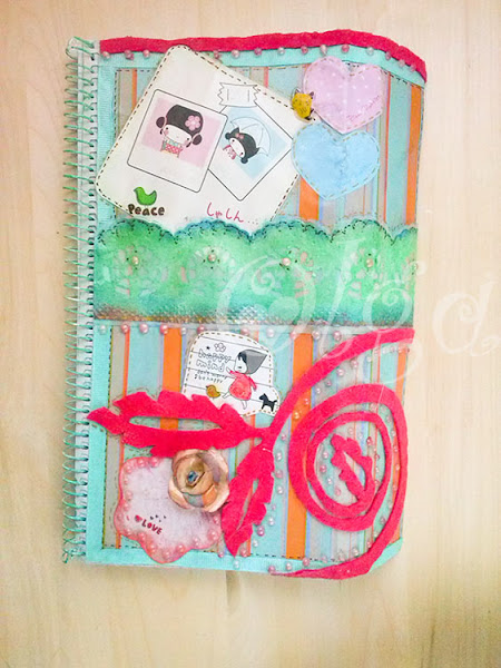 La tapa está decorada con todo lo que encontré, como ya os conté que hacía aquí, voy guardando chumineces y luego al menos las uso,con lo que no me siento tan mal conmigo misma...por lo del síndrome de diógenes, ya sabéis...En este proyecto he usado recortes de fieltro, pegatinas, cintas de tela...