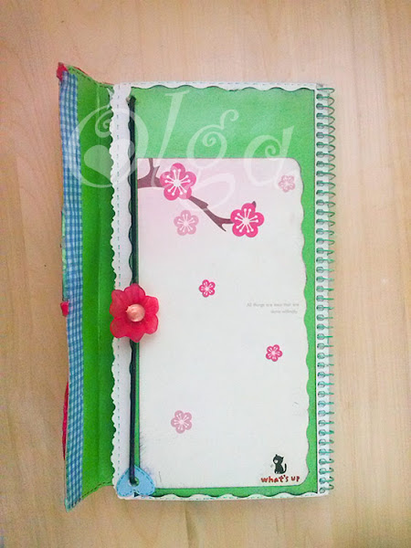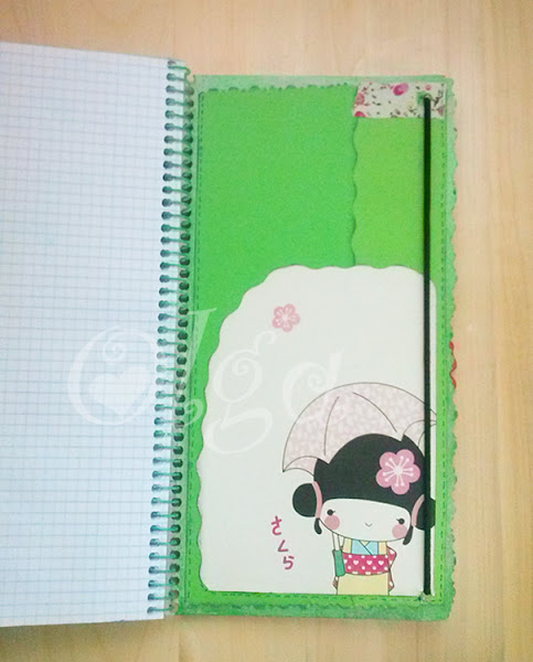 La tapa en su parte posterior sigue la misma línea, cartulina verde cortada en ondas, festoneado con rotulador imitando puntadas, y una hoja de la misma libreta en este caso con preciosas flores japonesas.