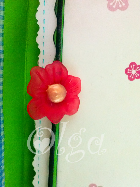 Este es un detalle del elástico que cierra la libreta. Lo he decorado con una flor acrílica de las que se usan como abalorios, y el centro está hecho con una gota de silicona caliente y una capita de esmalte de uñas irisado.