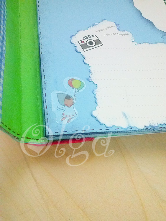 En el interior, hice un bolsillo plegando una cartulina para que hubiese espacio para guardar papeles y demás, también está decorado con pegatinas y recortes de unas libretitas preciosas que me compré en Aliexpress. También está forrada la tapa con cartulina verde , cinta de tela adhesiva y todo envejecido en los bordes con tinta de estampar azul y verde. Festoneado con un borde a rotulador imitando puntadas (aprendido de pega papel o tijeras)