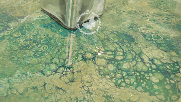 Esta hecha con la técnica del pouring o vertido de pintura pero con resina, se hace de la misma manera, hace unos meses decoré una caja con esta técnica podéis ver el vídeo más abajo.