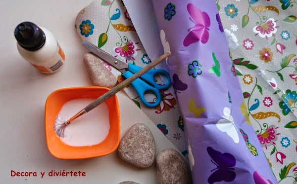 Y hoy después de pensar que hacer con ellas ,os propongo decorar las piedras con la técnica del decoupage . Pero un decoupage un poco de ir por casa , me explico .. utilicé papel de envolver regalos y este es el resultado :