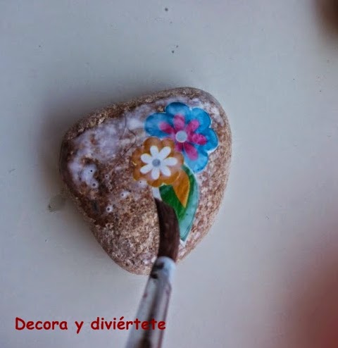 Después tenéis que pegar el dibujo con cola blanca , poniendo cola tanto debajo del dibujo como por encima del mismo . Cuando ya tengáis este paso hecho tenéis que dejar secar la cola blanca y una vez seca volver a pasarle una capa de cola blanca por encima del la piedra decorada , pero esta vez la rebajáis un poco con agua.