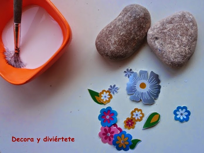 Primero tenéis que escoger los motivos con los que queréis decorar las piedras , en mi caso escogí unas flores, y recortar con mucho cuidado de no deformar el dibujo escogido