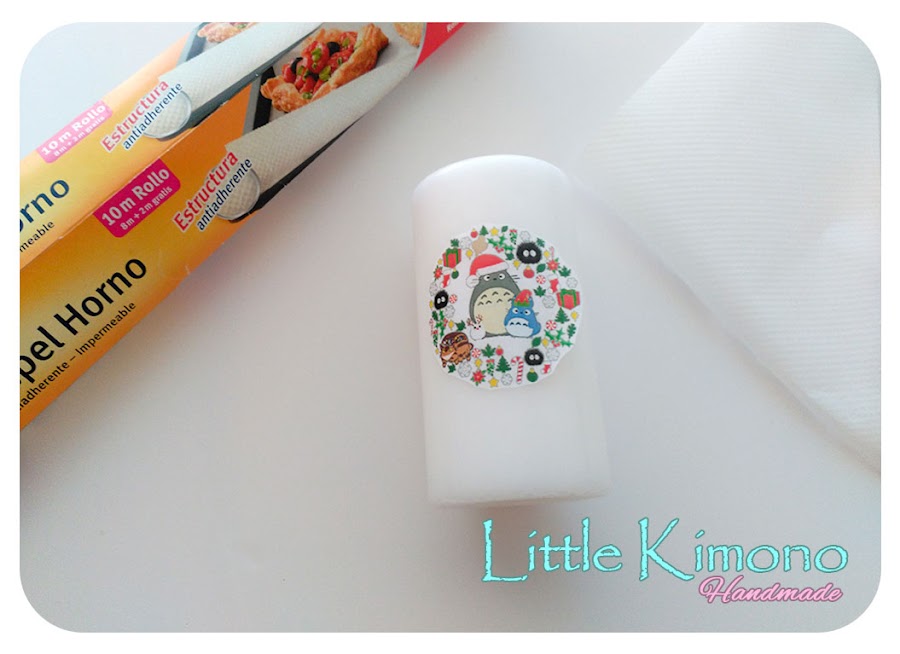4. Una vez hecho esto cubrimos la vela con un trozo de papel para el horno, esto ayudará a proteger la vela (y nuestra mano ^_^) un poco del calor.