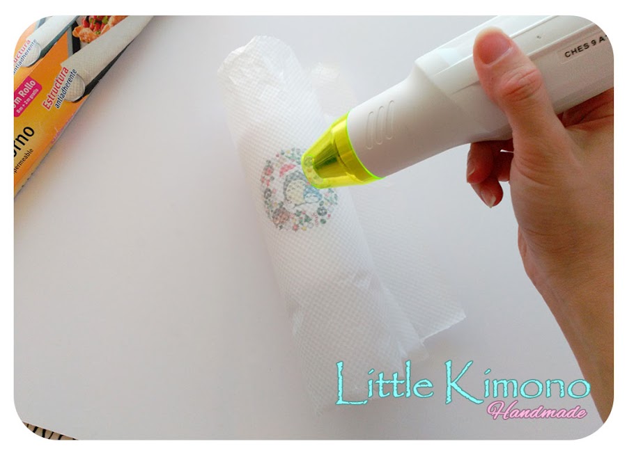 5. Ahora aplicaremos calor, yo utilicé la pistola de calor, lo haremos con movimientos circulares y rápidos para que no se derrita la vela en una sola zona, si no tenéis pistola también podéis usar un secador o frotar con una cuchara caliente sobre la imagen, veréis que cambia lentamente de color, así sabremos que ya está lista, de todas maneras no se tarda mucho unos segundos.