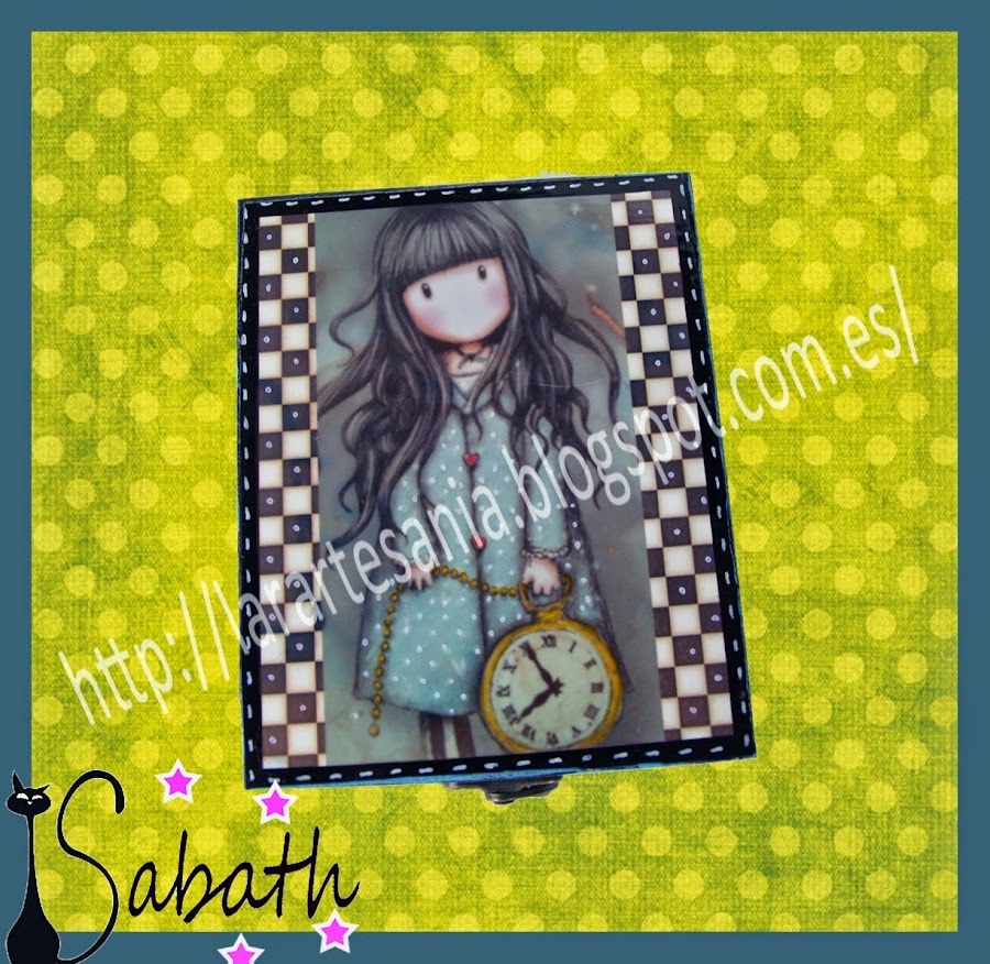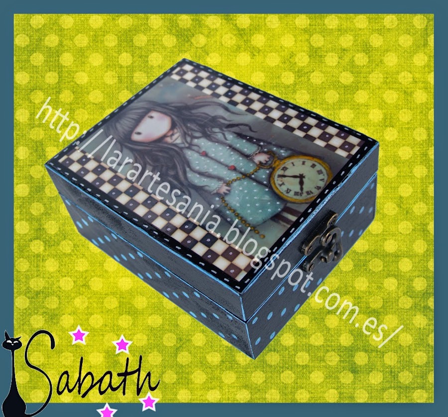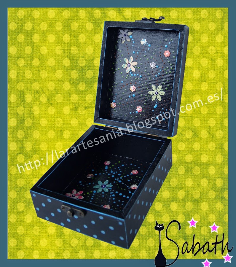 Sobre el decoupage la caja la pinte con acrílica negra, en los laterales realice un estarcido con plantilla de topos usando un color turquesa, con el mismo color remarque los cantos de la caja.