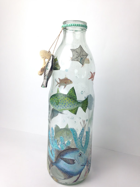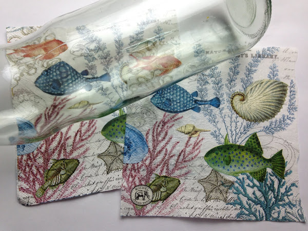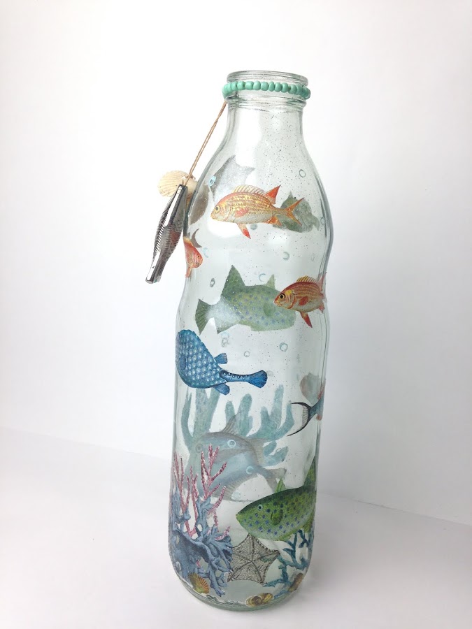 Una vez terminado se procede a pegarlos en la botella, se coloca laca o barniz al agua por el revés de la figura y se apoya en el vidrio de la botella. Esto se hace para impermeabilizar y que la botella se pueda usar y lavar.