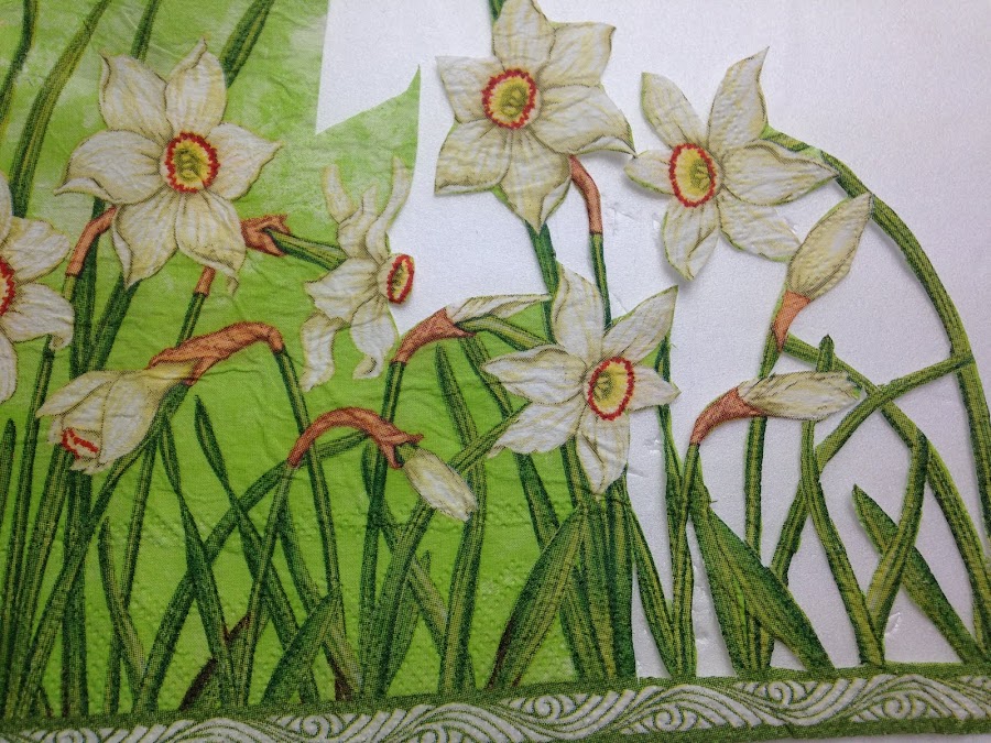 Se pega igual que el anterior, primero las flores del medio y luego se va agregando barniz para ir pegando de a poco, controlando que se mantenga la guia que es la guarda de abajo.