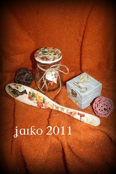 El frasco tiene dueña, me lo trajo a casa con una de sus exquisitas recetas y claro.... soy de devolver las cosas y se me ocurrió que mejor lo devolvía tuneado, los corazones son de pasta de sal con decoupage encima.