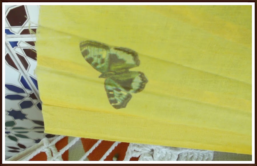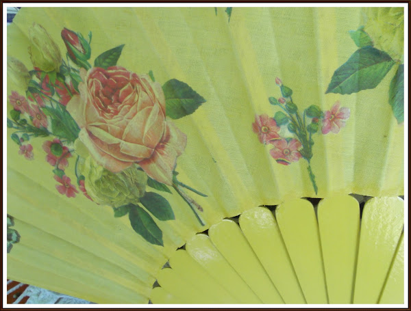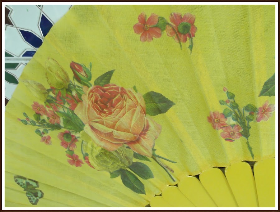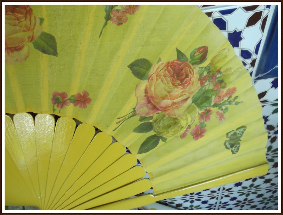 Hay que tener paciencia, porque hay que ir recortando con las tijeras todo el motivo, no vale cortar con los dedos o dejar espacios en blanco, porque al ser el abanico amarillo, si dejamos trozos de servilleta en blanco se verá al pegarlo.