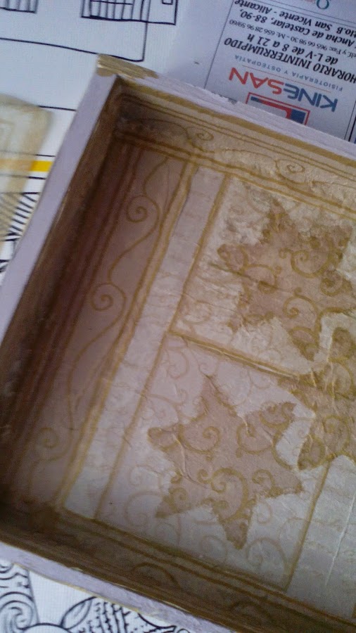 Pegamos la servilleta dentro centrando el dibujo, y si no nos cuadra podemos hacer un poco de "trampa" cortando trozos y pegándolos, en el canto le he dado con pintura acrílica dorada