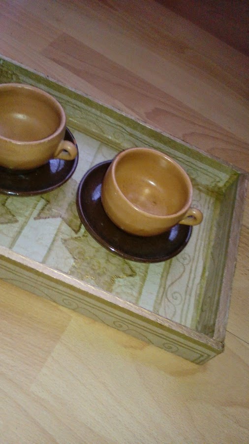 Este es el aspecto de mi caja terminada, le he dado una mano de barniz al agua, para proteger la decoración, que para utilizarla como bandeja es suficiente