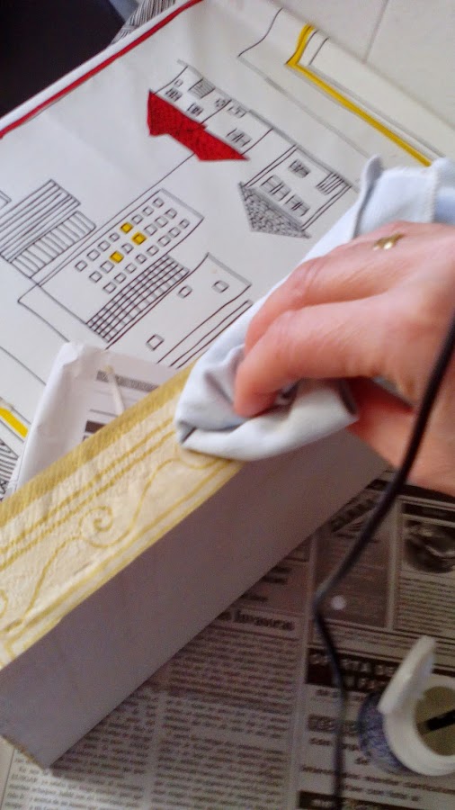 Primero lijar un poco para quitar imperfecciones y a continuación mano de pintura acrílica del color que mas os guste y combine con la servilleta.