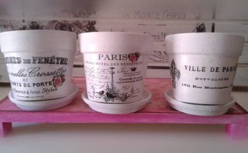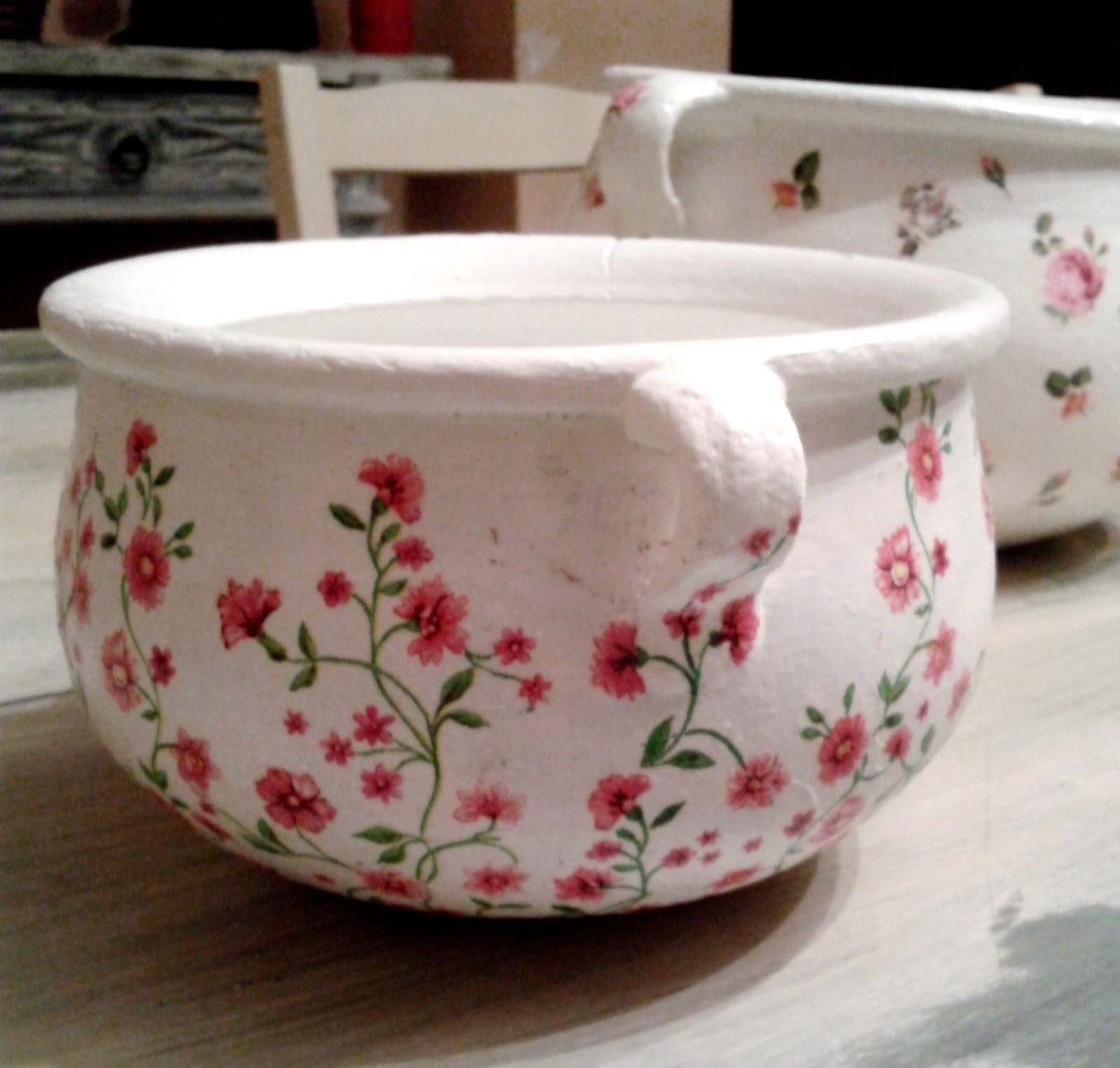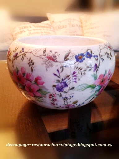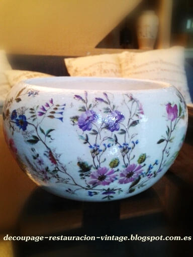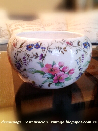 A este recipiente le ha tocado un decoupage con una especie de flores de almendro con otras florecillas más pequeñas y para acabar unas manos de barniz para parecer otro. Espero que os guste: