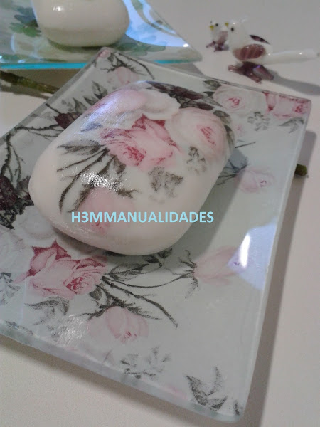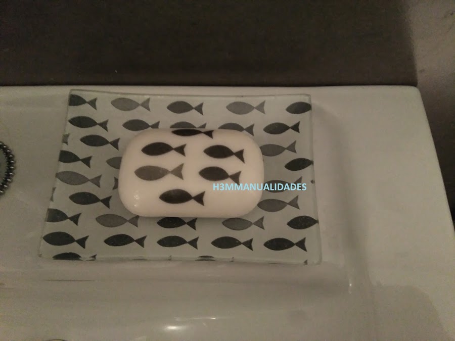 En todos los casos me encargaron conjuntos de jabones y jaboneras de cristal. Y los motivos también los eligieron ellas. En unos casos, más románticos, como las rosas; en otros, motivos frescos, en verdes, como esos tréboles o siguiendo un patrón repetido con el blanco y negro de esos peces.