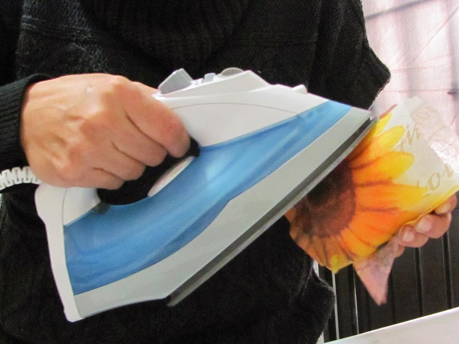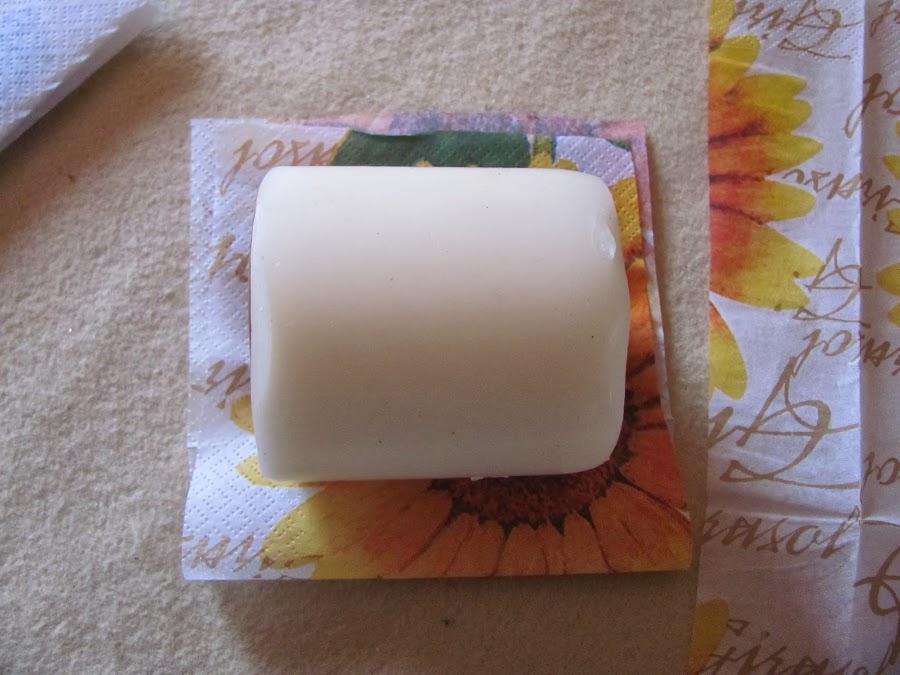 3.- CON LAS PIEZAS CORTADAS (DE UNA SERVILLETA ALCANZO PARA 3 VELAS), EMPEZAREMOS A COLOCAR EL PAPEL ALREDEDOR DE LA VELA. ESTO LO HAREMOS CON AYUDA DE LA PLANCHA, LA CUAL PONDREMOS A TEMPERATURA MEDIA Y SIN VAPOR. CON MUCHO CUIDADO IREMOS PASANDO LA PLANCHA POR SECCIONES DE LA VELA. EMPEZAREMOS A NOTAR QUE LA CERA SE DERRITE UN POCO Y TRANSPASA EL PAPEL AL EXTERIOR, ESTO DARA EL TOQUE BRILLANTE Y PROTECTOR AL PAPEL.