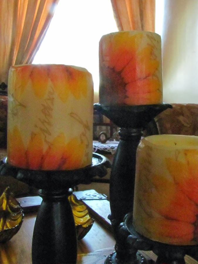 5.- AFINADOS LOS BORDES Y LA UNION, TENEMOS LISTAS NUESTRAS VELAS EN LA TECNICA DE DECOUPAGE PARA PONERLAS DE NUEVO EN NUESTRA DECORACION.
