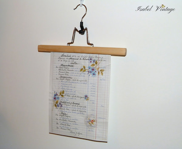Página de libro de balances decorada con decoupage expuesta como lámina mediante una percha para pantalón