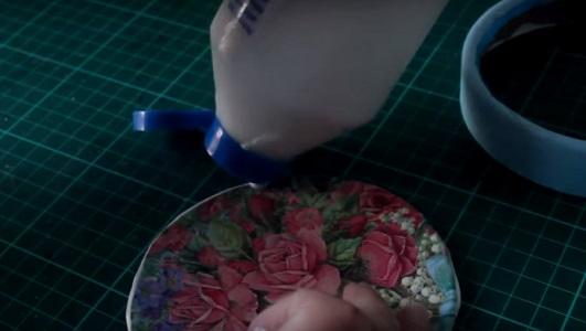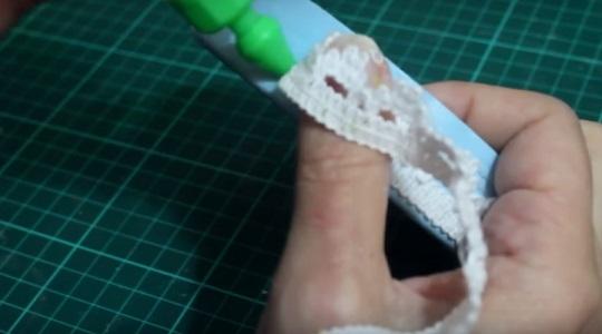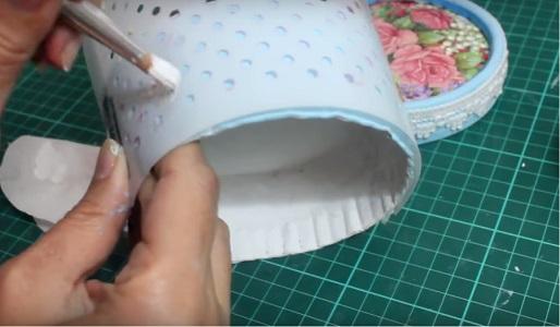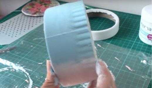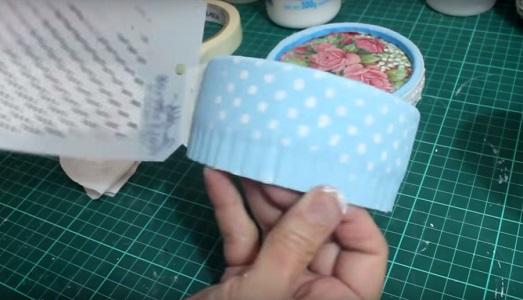 Para decorar la tapa colocamos silicona fría y pegamos una puntilla…