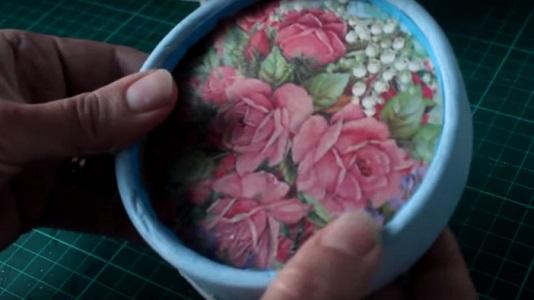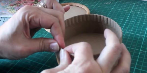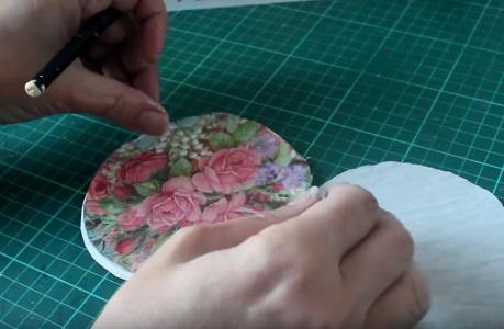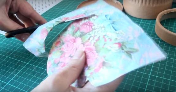 Para el decoupage vamos a utilizar una servilleta decorada, para eso vamos a tomar la medida utilizando el círculo de cartón de la tapa.