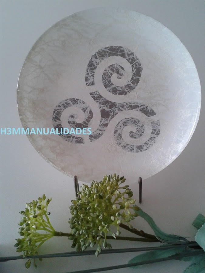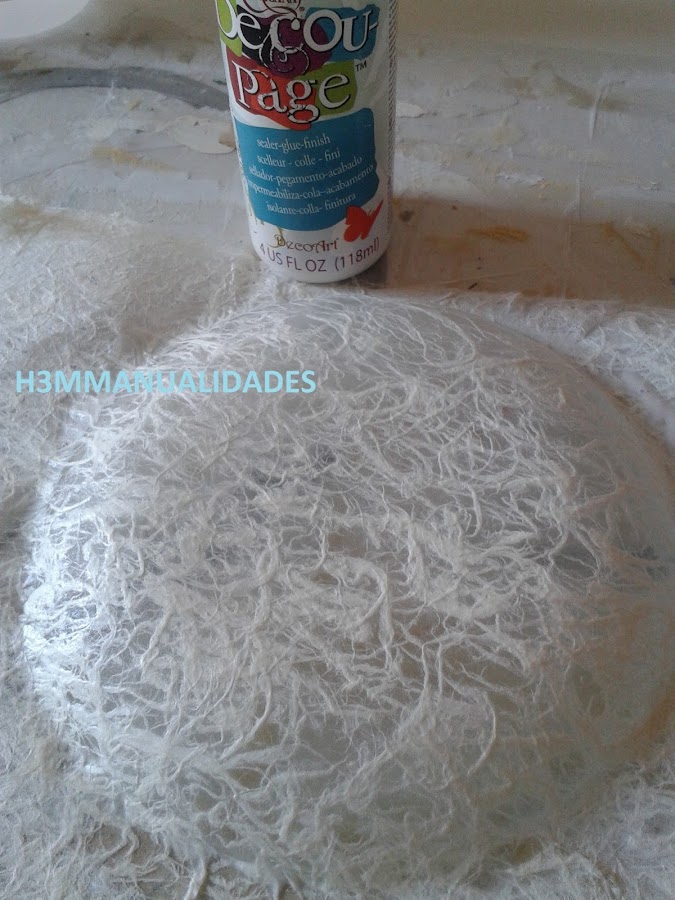 1- tras limpiar bien el plato de restos de etiquetas y demás, damos una capa de cola para decoupage.