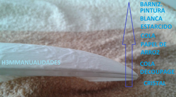 7- para acabar, damos una capa de barniz mate, lo que protegerá toda la superficie trasera y el trabajo realizado sobre el plato. En la siguiente imagen intento señalar el orden, desde abajo hacia arriba, de los materiales que se han ido colocando
