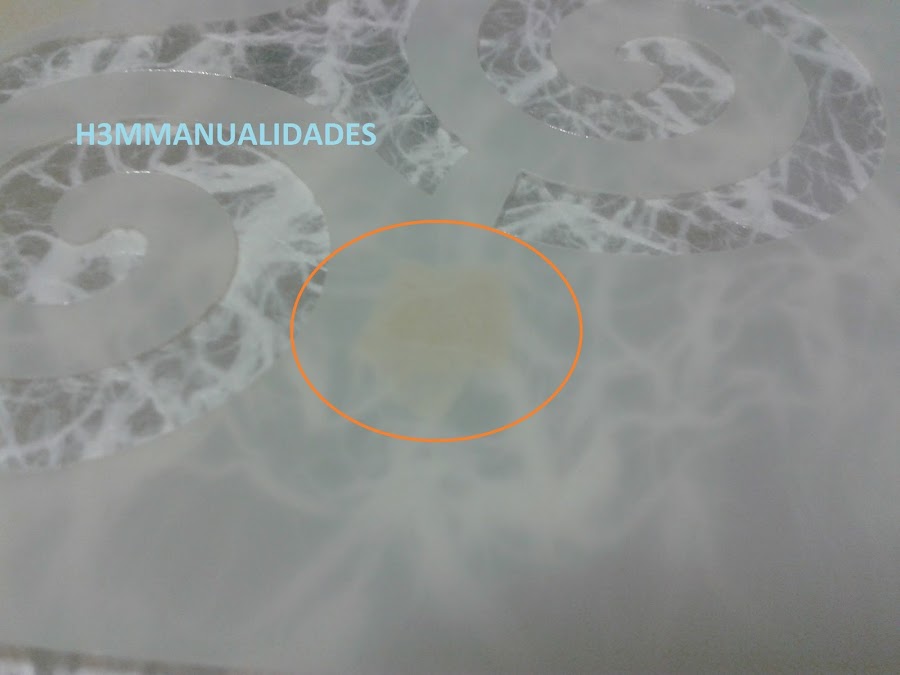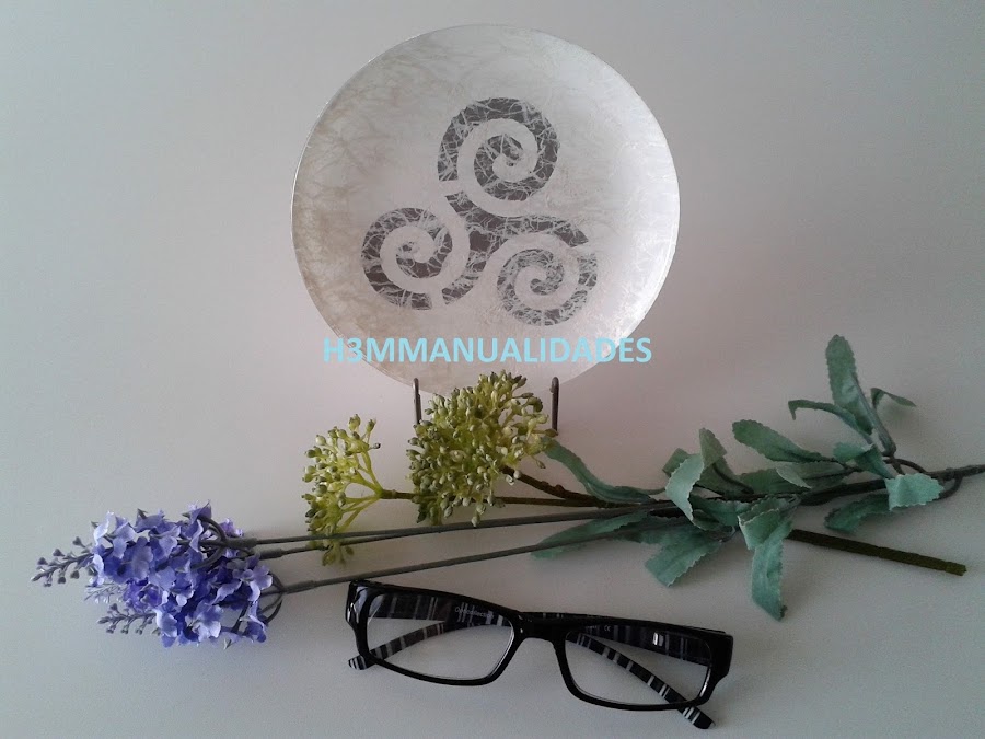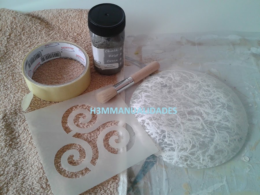4- colocamos la plantilla de la imagen elegida. En mi caso es una imagen de un triskel, figura celta que a mi me encanta. Por cierto, fue un encargo de hace más de un año a Lucía, de Momentos Vintage. Para asegurarse de que está bien pegada y no se nos cuele la pintura bajo la plantilla, yo la he pegado por debajo con cinta de carrocero (se intuye dentro del óvalo naranja de la segunda imagen)