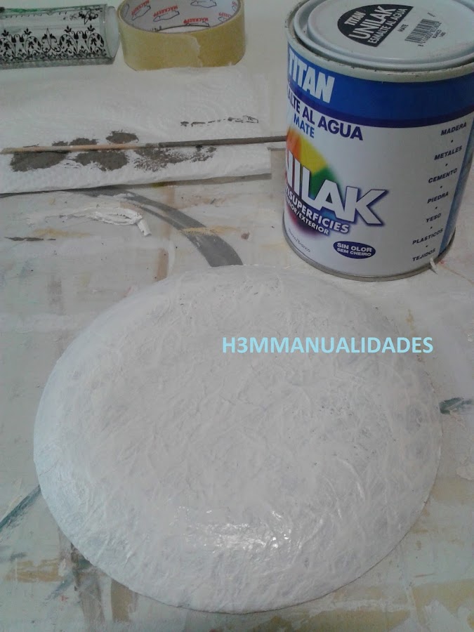 6- una vez seca, con una lija quitamos el papel sobrante del borde del plato y pintamos con esmalte al agua, blanco en este caso.