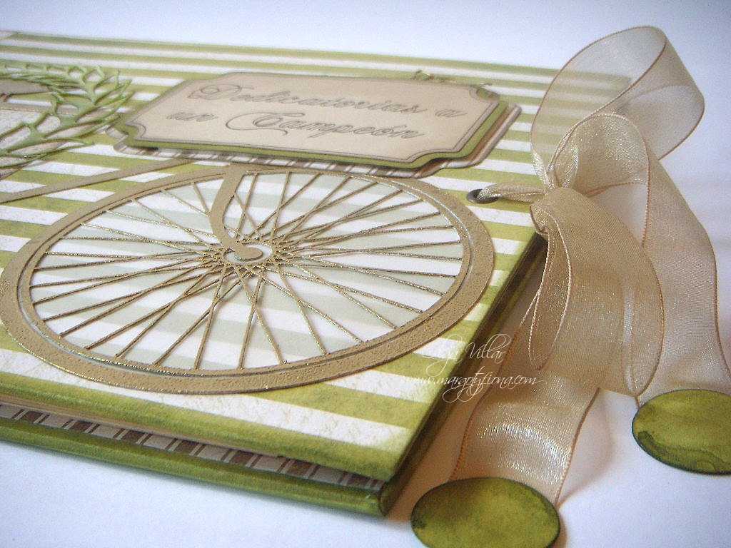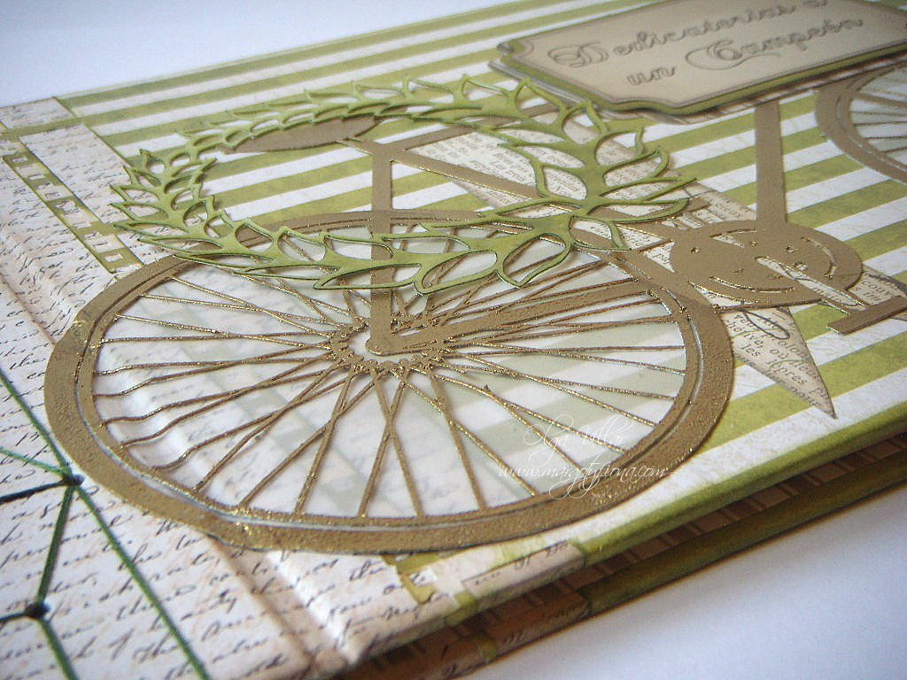 Sobre la bicicleta dorada embosada con polvos dorados de Artemio, hay colgando una corona de laurel, pintada en verde y embosada en UTEE, que le da un brillo y relieve precioso.