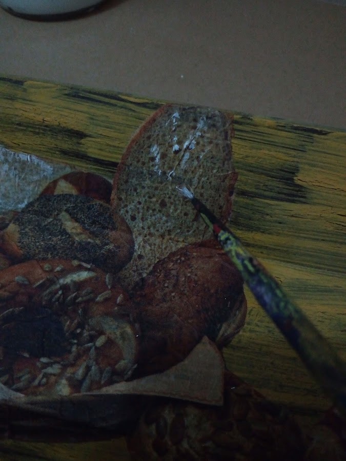 Cuando la servilleta seca algunas veces se pierde un poco la imagen porque se integra bien en la superficie, lo que hago es que en ciertos detalles pinto con pinceladas de blanco y esto le crea luz y volumen a la imagen, igual alrededor se sombrea un poco con un color mas oscuro que la base.