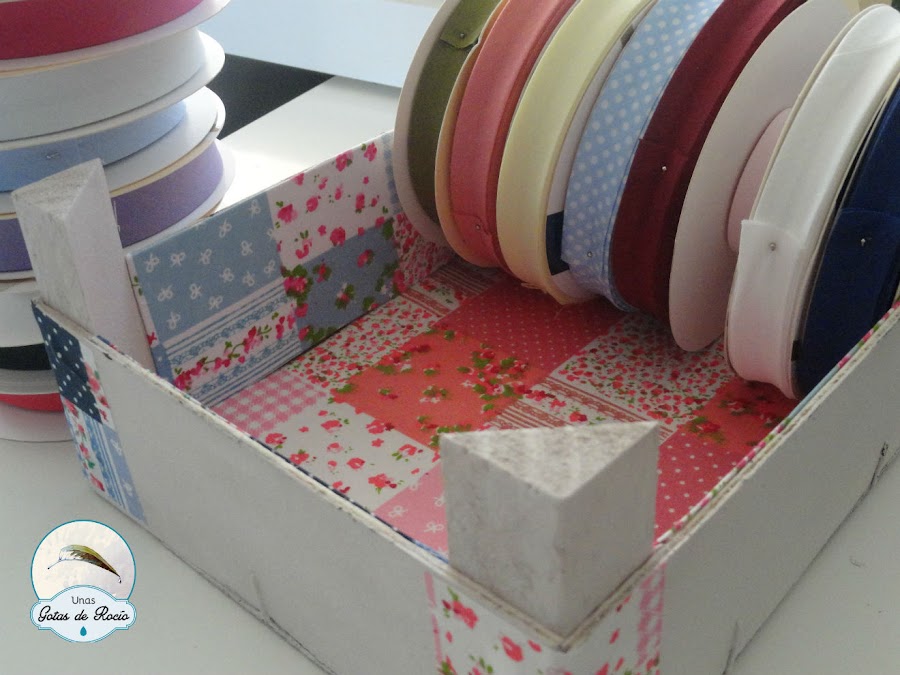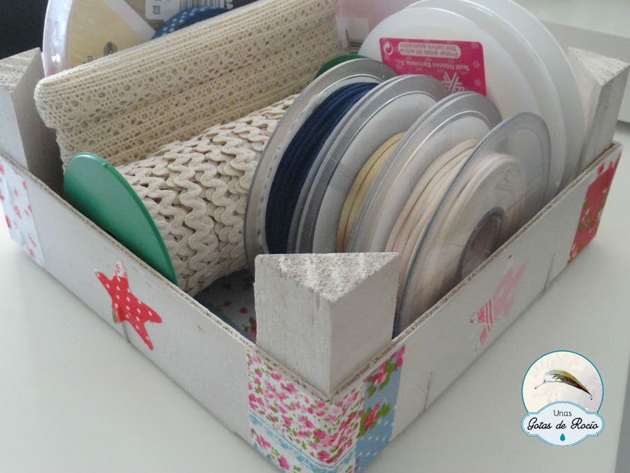 Una nueva caja de fresas ha sido la solución. Decorándola igual que la anterior que pinté en una mañana de sol, forman un conjunto la mar de mono. Así que la desterré de su primer destino junto a la caja de gambas y la reubiqué en mi mueble de telas.