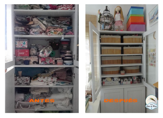 En Semana Santa me atreví a mostrar en mi página de facebook el caos de mis telas y me propuse ordenarlas en esos días. Le di un buen empujón pero hasta hace poco no he logrado que tenga apariencia de orden. El antes y el después es tan llamativo que he hecho un montaje donde se puede ver perfectamente.