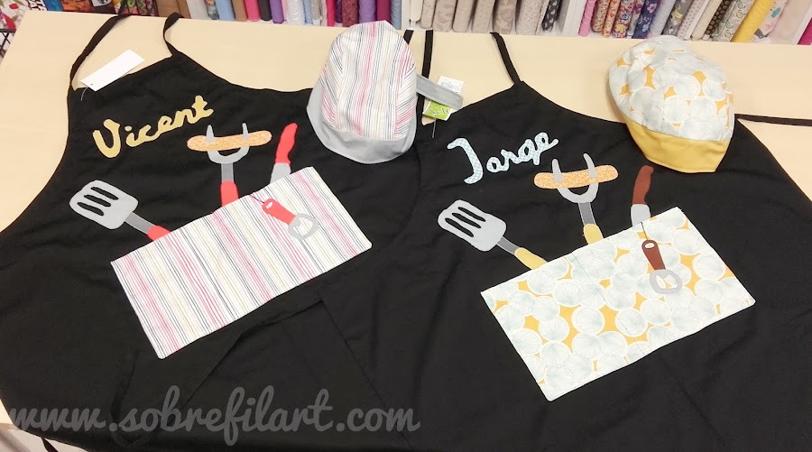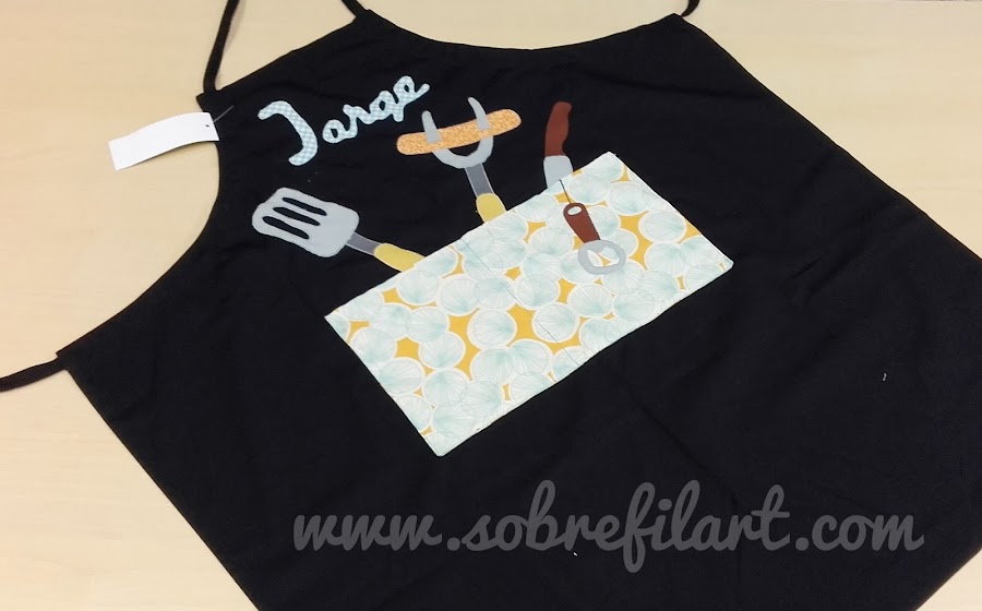 Para la confección de éste modelo nos hemos inspirado en las barbacoas y le hemos aplicado utensilios de barbacoa. También le hemos cambiado el bolsillo y lo hemos puesto a conjunto al diseño.